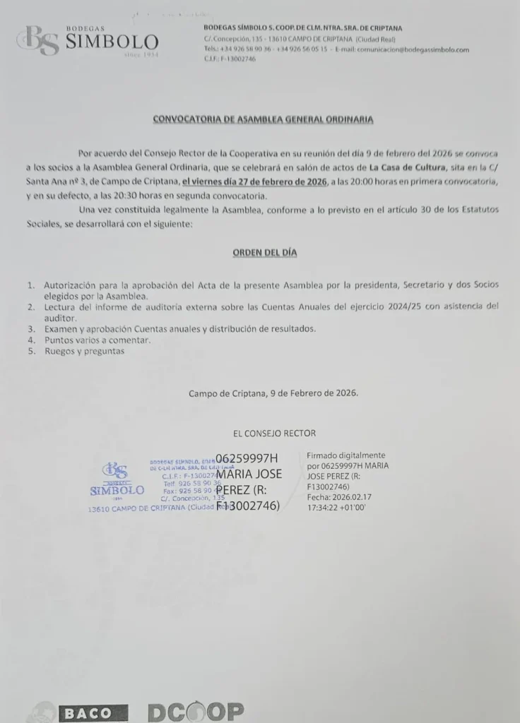 El Consejo Rector de Bodegas Símbolo de Campo de Criptana ha convocado a los Socios a la Asamblea General que se celebrará en el salón de actos de la Casa de Cultura, sito en la C/ Santa Ana nº3 de la localidad, el día 27 de febrero de 2026, a las 20:00 horas en primera convocatoria, y en su defecto, a las 20:30 horas en segunda convocatoria.